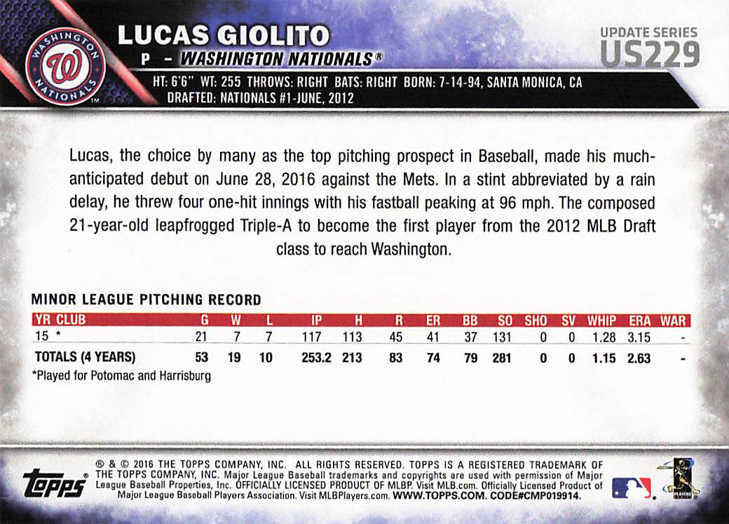 2016 Topps Update Series Lucas Giolito #US229 RC
